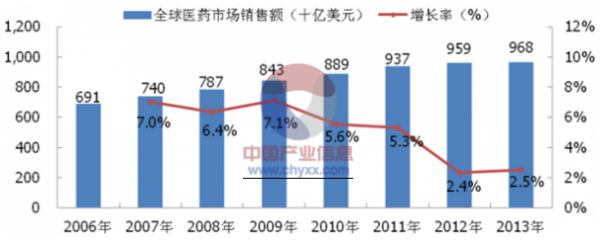 IMS統(tǒng)計數(shù)據(jù)顯示:2006-2013年間,全球醫(yī)藥市場規(guī)模由6,910億美元上升至 9,676億美元,年平均增長率4.93%。