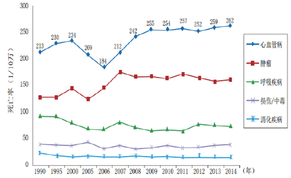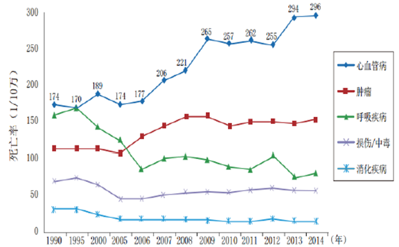 1990~2014年中國城市居民主要疾病死亡率變化