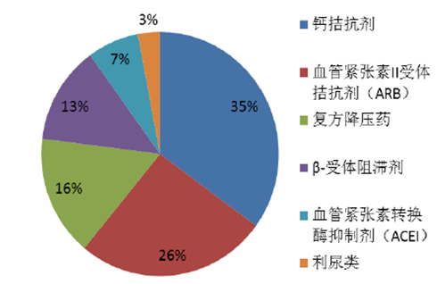 2015年我國各類降壓藥中,鈣離子通道阻滯劑、血管緊張素II受體拮抗劑(ARB)以及復方制劑占據了大半的市場份額,分別占比為35%、26%和16%。
