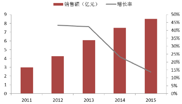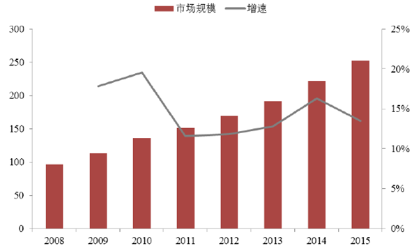 2008-2015年我國抗高血壓藥市場規模(億元)