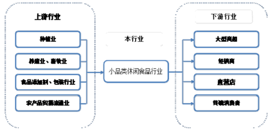 傳統休閑食品行業屬于食品制造業,是產業鏈的中間環節,上下游關系如下圖所示: