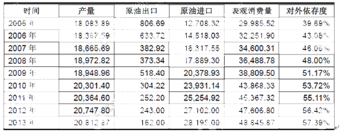 2005年-2013年中國原油出口、進口以及對外依存度統計數據(單位:萬噸)