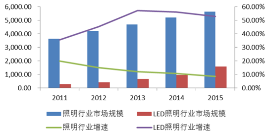 2015年,全球經(jīng)濟(jì)出現(xiàn)了下滑的情況,我國(guó)整體經(jīng)濟(jì)形勢(shì)增速逐漸放緩,在整體大環(huán)境的影響下,進(jìn)出口貿(mào)易受到很大影響,許多行業(yè)的出口不增反降,但是我國(guó)照明行業(yè)依舊保持平穩(wěn)的增長(zhǎng)。 2015年, 照明行業(yè)總體市場(chǎng)規(guī)模達(dá)到 5640億元,增速達(dá) 8.5%;此外,LED照明發(fā)展迅速,技術(shù)革新快,整體市場(chǎng)表現(xiàn)強(qiáng)勢(shì),在國(guó)內(nèi)和國(guó)際的市場(chǎng)份額也逐步上升, 2015年, 我國(guó) LED照明市場(chǎng)規(guī)模達(dá)到 1576億元,增速維持在50%以上。