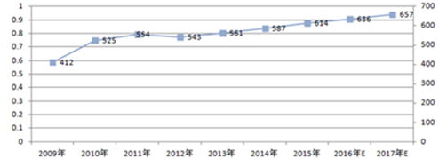 2009-2017年全球PCB電路板總產值及預測