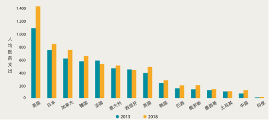 至 2018 年,受到人口增長、人口老齡化以及新興醫藥市場醫療普及情況提高等因素的影響,全球醫藥總支出預計將達1.28-1.31萬億美元,相比2013年增加 2,900-3,200億美元。