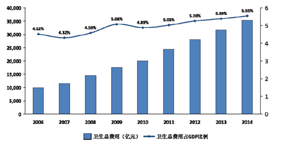2006年至2014年,我國衛生總費用占GDP的比例由4.52%提高至5.55%,衛生部發布的《健康中國2020 戰略研究報告》指出,到 2020 年,我國衛生總費用占 GDP 的比例將達到6.5%至 7%。