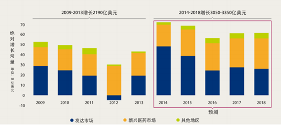 根據IMS的 《2018全球醫藥市場展望》 ,2014年,全球醫藥支出增長飆升,增長金額從2013年的400億美元提升至700億美元。2014年醫藥支出增速將放緩,但相比過去五年,仍將維持在較高的水平。以美國、歐洲五大市場 (德國、法國、意大利、西班牙、英國)和日本為主導的發達市場是支出增長的主要動因,未來五年,21 個新興醫藥市場對全球醫藥支出增長的貢獻率將進一步加大,至 2018 年預計近半數的支出增長將由新興市場貢獻。