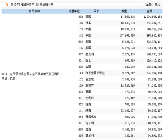 2015年我國空氣泵等進口主要國家及地區分析(8414)