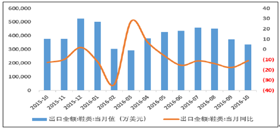 鞋類的出口形勢處于弱勢,1-10月份月度出口金額累計同比下降13.9%,較去年同期累計降幅擴大8.8個百分點,較今年上半年累計降幅擴大2.4個百分點,其中9、10月份同比降幅分別為17.64%、10.97%。
