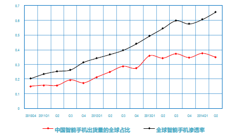 2010-2016年全球智能機季度出貨量及增速(百萬部)
