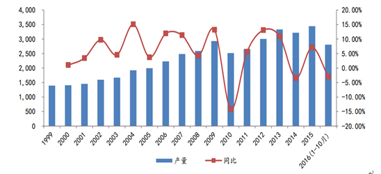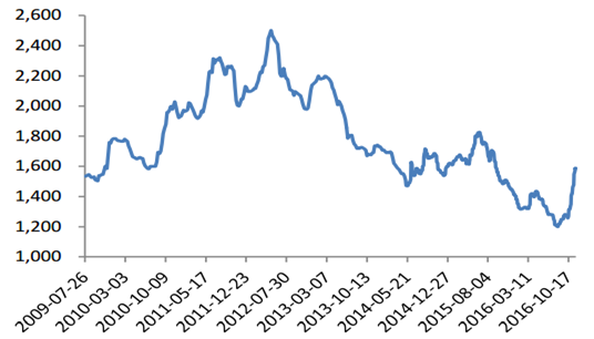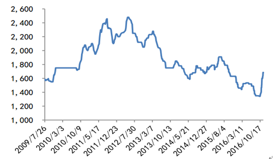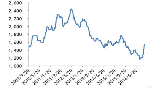 我國尿素下游有三大銷售渠道:農(nóng)業(yè)需求、工業(yè)需求和出口需求。2012 年 5 月份,我國尿素價格達(dá)到了最高點后,開啟了一段四年多的下行周期。其在這期 間大幅下降的主要原因有產(chǎn)能提升過快、煤炭價格下跌、糧食價格下降、國際尿素價 格下行等。時至2016年 8 月中旬,國內(nèi)尿素價格最低已不到 1200 元/噸,尿素行業(yè)面臨 著全行業(yè)的虧損或者不盈利。但在煤炭價格大漲、優(yōu)惠電價取消、運輸成本增加、環(huán) 保整治導(dǎo)致開工率低(年內(nèi)最低開工率 46%)、庫存量持續(xù)下降等多重因素疊加之下, 從2016年 8 月下旬起,尿素開啟了一波較大幅度的反彈,目前華東市場尿素的市場價維 持在 1550-1600 元/噸,華南市場尿素的市場價維持在 1650-1700 元/噸。