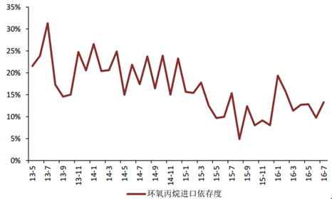 據(jù)統(tǒng)計(jì),2013-2014 年,我國(guó) PO 的進(jìn)口依存度在 25%左右,隨著國(guó)內(nèi)產(chǎn)能的 釋放,進(jìn)口依賴度有所降低。但 2015 下半年至今,進(jìn)口依賴度基本穩(wěn)定在 15%左右。從年 初低點(diǎn)至今,進(jìn)口環(huán)氧丙烷價(jià)格同樣上漲接近 40%。