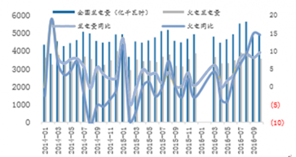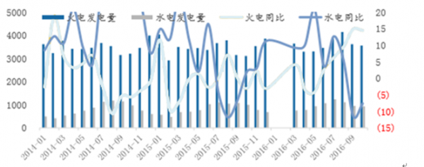 2016年上半年水電發(fā)電量增勢喜人,實現(xiàn)同比10%以上增長,但到了 下半年則增速快速下滑。正值冬季用電高峰,又疊加經(jīng)濟(jì)回暖,全國耗電量同比快 速回升,水電不足的缺口還得由火電補上,動力煤消耗量大增。