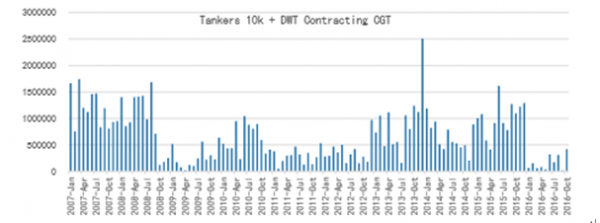 由于前面兩年訂單相當(dāng)集中,到16年初 開(kāi)始,油輪新增訂單量呈斷崖式下滑。