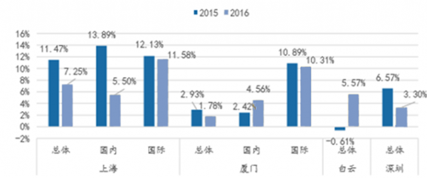 核心提示:2016年1-10月份,國(guó)內(nèi)上市機(jī)場(chǎng)累計(jì)起降架次同比增速顯著放緩。上海、深圳等城市 增速下降明顯,短期內(nèi)樞紐機(jī)場(chǎng)受產(chǎn)能利用率逐步飽和及航班準(zhǔn)點(diǎn)率等外部因素影 響業(yè)務(wù)量增幅將大概率繼續(xù)趨緩。對(duì)比15年前10月,除白云機(jī)場(chǎng),A股上市機(jī)場(chǎng)起降架次2016年1-10月份,國(guó)內(nèi)上市機(jī)場(chǎng)累計(jì)起降架次同比增速顯著放緩。上海、深圳等城市 增速下降明顯,短期內(nèi)樞紐機(jī)場(chǎng)受產(chǎn)能利用率逐步飽和及航班準(zhǔn)點(diǎn)率等外部因素影 響業(yè)務(wù)量增幅將大概率繼續(xù)趨緩。