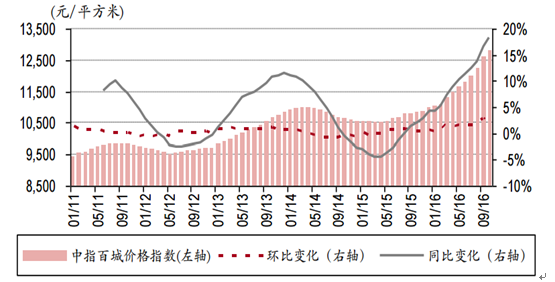 2016 年 10 月份 100 個大中城市住宅銷售價格為 12,825 元/平米,環比上升 1.65%,較上月回落 1.18 個百分點,同比上升 18.21%, 較上月擴大 1.57 個百分點。按中位數計算,全國 100 個城市住宅價格中位數為 7,306 元/平方米,環比上漲 2.20%,同比上漲 2.67%,百城中多數城市房價走勢 較為平穩。從價格來看,10 月百城整體價格漲幅明顯放緩,上漲城市數量減 少,且多數熱點城市房價漲幅均有所回落,部分城市回落幅度顯著。