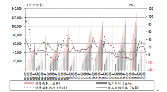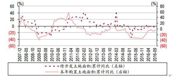 從土地口徑來看,截至 2016 年 10 月,全國商品房待開發土地面積為 3.43 億平 米,同比下降 2.7%;1-10 月,全國累計購臵土地面積為 1.69 億平米,同比下 降 5.5%。雖然 2016 年相較 2015 年土地購臵面積同比 32%的降幅有所回暖,但 全國范圍內的土地市場成交水平仍較火熱樓市的表現有較大差距,主要由于 三四線的高庫存問題仍制約開發商的拿地熱情。未來隨著樓市銷售的降溫, 全國土地成交活躍度或再度承壓。