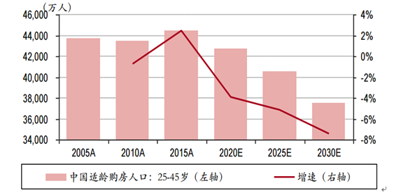 由于國內人口紅利消失、城鎮化速度的趨緩以及人均居住面積提升空 間的縮小等因素,我國未來 10-20 年中增量住宅需求有限。根據人口結構測算, 我國 25-49 歲購房適齡人口在 2015 年達到峰值,并從 2018 年開始急速下降。其中,25-29 歲的適齡結婚人口在未來 5 至 10 年將呈現斷崖式的下滑:2020 年 (2015 年 20-24 歲)的適齡結婚人口相較 2015 年(2015 年 25-29 歲)降幅達到 22%,2025 年(2015 年 15-19 歲)的適齡結婚人口相較 2020 年(2015 年 20-24 歲)降幅達到 25%,下一輪地產周期的新房需求總量將顯著小于此輪周期,以 此類推,預計此輪地產周期的經歷內生性調整的幅度或超過往年。