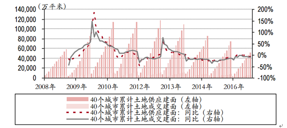 40 個重點城市累計土地供應和成交規劃建筑面積增速