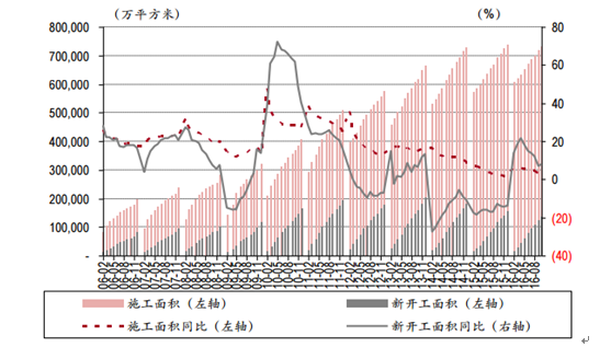 2016 年 1-10 月,全國房地產開發投資額同比增長 6.6%,較 1-9 月擴大 0.8 個百 分點;商品房新開工面積同比上升 8.1%,較 1-9 月擴大 1.3 個百分點;施工面 積同比上升 3.3%,增速較 1-9 月持平;土地購臵面積同比下降 5.5%。10 月單 月新開工面積和投資增速分別大幅上升至 20%和 13%,后者創出年內新高,而 施工面積增速也由負轉正。隨著庫存去化月數持續走低,四季度投資增速企 穩回升趨勢明顯,托底年內中國經濟。