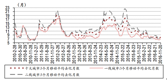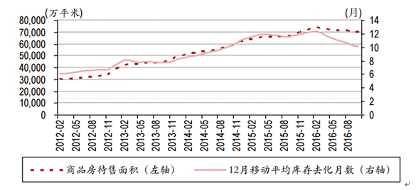 截至 2016 年 10 月,全國商品房待售面積為 6.95 億平米,已連續 8 個月環比下 降,庫存去化效果初顯;但待售面積同比仍然增長 1.3%,即經歷2016年樓市火 爆后,目前的庫存水平僅回到了 2015 年 11 月水平;若考慮到加快的銷售去化 速度,全國可售面積 12 個月移動平均去化月數也僅回到了 2014 年 9 月水平, 即此輪地產周期的起漲點,整體庫存仍居歷史高位。