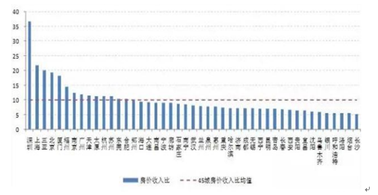 雖然樓市杠桿率可控,但由于此輪房價的暴漲,反映購房支付能力的房價收 入比指標也在迅速攀升。根據統計顯示,全國 45 城房價收入比 均值為 10.1,一線城市和東部沿海城市,明顯整體高于內陸其他城市,深圳、 上海、三亞、北京、廈門分列前五位,房價收入比均超過 15,其中深圳高達 36,遠超全球平均房價收入比 6-7 的均值。