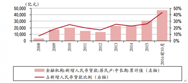 伴隨著此輪樓市的暴漲,國內居民的杠桿率水平激增:2016 年前 10 月,金融 機構新增人民幣貸款中居民戶中長期貸款額為 4.7 萬億元,占同期金融機構新 增人民幣貸款的 43.4%,同比提升 17.3 個百分點,顯示居民購房貸款率水平正 迅速攀升。但目前國內居民購房杠桿率仍處合理水平,后期系統性 金融風險爆發的可能性較小,居民部門仍有加杠桿的空間。