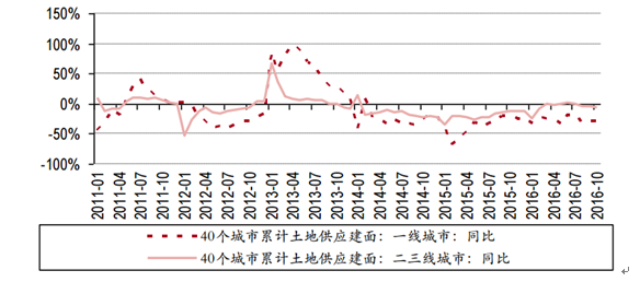 從結構來看,跟蹤的 40 個城市土地市場情況顯示,2016 年 1-10 月 40 個重 要城市供應土地規劃建筑面積同比下降 7.8%,成交土地規劃建筑面積同比下 降 10.7%,其中一線城市分別同比下降 29%和 32%,供應大幅收縮而需求火熱 導致地王頻現,政府無奈采取暫停供給的方式進行調控,與三四線城市形成 鮮明對比,若2017年一二線供地持續收縮,地市或與樓市同樣經歷寒冬考驗。
