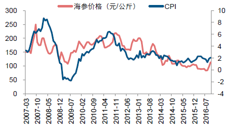 核心提示:近年來由于海參價格持續(xù)下行使得養(yǎng)殖積極性有所下降,14、15年連續(xù)兩年全國海參產(chǎn)量增速處于較低水平,海參供給后期或?qū)⒅鸩狡蠓(wěn)。需求方面在經(jīng)歷三公消費打擊后,行業(yè)需求正逐步呈現(xiàn)回暖趨勢,預計海參行業(yè)供需正處于邊際改善時期。同時,從歷史數(shù)據(jù)來看近年來由于海參價格持續(xù)下行使得養(yǎng)殖積極性有所下降,14、15年連續(xù)兩年全國海參產(chǎn)量增速處于較低水平,海參供給后期或?qū)⒅鸩狡蠓(wěn)。需求方面在經(jīng)歷三公消費打擊后,行業(yè)需求正逐步呈現(xiàn)回暖趨勢,預計海參行業(yè)供需正處于邊際改善時期。同時,從歷史數(shù)據(jù)來看,海參價格同CPI高度相關(guān),即CPI高企或?qū)⒋碳ず⑿枨筮M一步增長。因此在明年農(nóng)產(chǎn)品價格或大幅上漲從而帶動CPI上行背景下,海參價格也有望繼續(xù)上漲,預計明年海參均價或達120元/公斤,較今年增長20%。