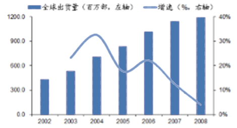 從 2002 年開始,以諾基亞、摩托羅拉、愛立信等品牌為代表的功能手機開始在全 世界范圍內快速普及。根據 IDC 的統計數據,2002 年全球功能手機出貨量為 4.3 億部, 到 2008 年提升到 11.9 億部,復合年均增速 18.4%。