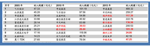 中國電子元件行業協會統計的中國電子元件百強企業,是根據公司的盈利能力、償 債能力、經營能力等因素給出的綜合排名。分析 2005 到 2010 年,再到 2015 年排名前 10 的公司,與通信相關的光電線纜公司始終占據著大部分,但是與手機相關的公司發展 迅速,如 2015 年的聲學器件公司(瑞聲科技、歌爾股份)、連接器公司(立訊精密、中 航光電),這說明中國大陸在智能手機的帶動下,已經在部分電子元器件領域出現了實 力強勁的龍頭企業。