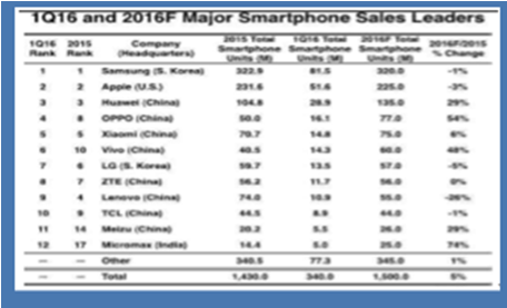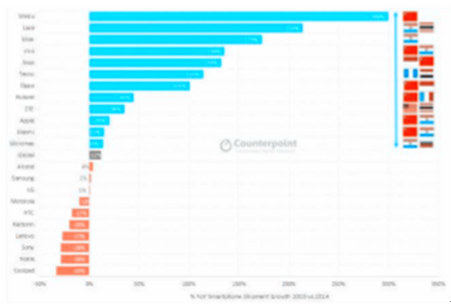 如今,中國已經成為全球智能手機出貨量最大的市場,中國品牌也是全球最大的智 能手機生產商。根據 Counterpoint Research 公布的統計數據顯示,2015 年智能手機 廠商中最令人印象深刻的增長不是來自美國或韓國的廠商,而是中國和印度的小型智能 手機廠商在新興市場中出盡了風頭。來自中國的 Meizu、Vivo 和 Oppo 增長率均超過 100%。更成熟的品牌,如華為,中興通訊等也取得了令人印象深刻的成長數字。