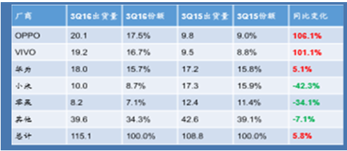 2016年Q3 大陸智能手機出貨與份額(份額:%;出貨:百萬)