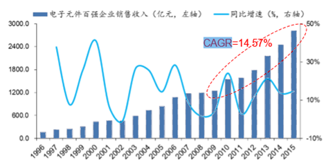 1996-2015 年中國大陸電子元件百強企業收入情況