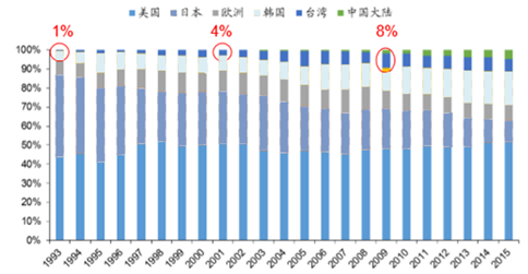 根據全球半導體產業協會 的數據,臺灣地區的半導體企業營收占全球份額在 1993 年不到 1%,到 2000 年的份額 已經達到 5%左右,到 2009 年進一步提升至 8%。