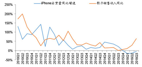 iPhone 核心供應商歌爾股份銷售收入與 iPhone 銷量高度相關