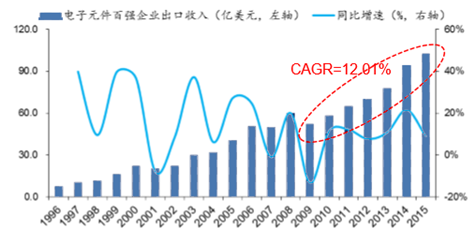 中國電子元件百強企業在 2015 年實 現出口收入 102.7 億美元,自 2009 年的 52.0 億美元翻了一倍,CAGR 約為 12.01%。