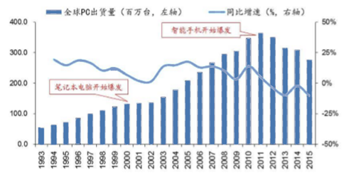 在 20 世紀 90 年代初期,PC 個人電腦終于在 IBM、英特爾、微軟、思科等一大批 巨頭的推動下,迎來了產業的爆發式增長,從此 PC 進入高速發展期。1995 年左右開始, 臺式電腦大規模進入普通歐美家庭,2000 年左右筆記本電腦爆發式增長,尤其是 2000 年左右 PC 電腦進入亞太市場以及互聯網的快速普及,徹底激活了 PC 市場。