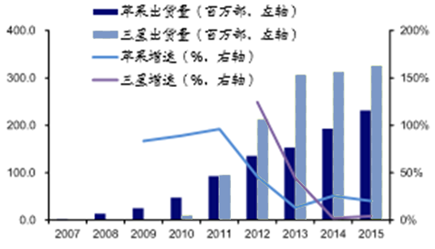 2007-2015 年蘋果和三星智能手機出貨量情況
