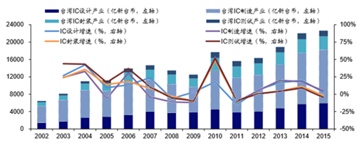 與此同時,臺灣地區的 IC 集成電路產業也隨之獲得了巨大的成功。臺灣地區的 IC 設計產業到 2015 年達到 5927 億新臺幣,約合 178 億美元,復合年均增速 11.5%;IC 封裝+測試產業到 2015 年達到 4413 億新臺幣,約合 132 億美元,復合年均增速 10.5%; IC 制造產業到 2015 年達到 12300 億新臺幣,約合 369 億美元,復合年均增速 9.5%。
