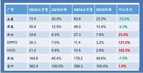 2016年Q3 全球智能手機出貨與份額(份額:%;出貨:百萬