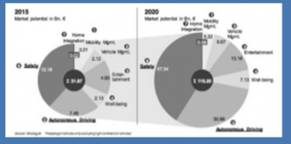 在全球 范圍內(nèi),車聯(lián)網(wǎng)中最大的三塊:一個是安全,主要是指車身安全;第二是自動駕駛;第 三是娛樂系統(tǒng),預(yù)計未來五年都是高速增長。如安全將從 2015 年的 121.8 億歐元增長 至2020年的473.4億歐元,自動駕駛將從2015年的74.9億歐元增長至2020年的356.6 億歐元。整個全球車聯(lián)網(wǎng)總市場將從 2015 年的 318.7 億歐元增長至 2020 年的 1152.0 億歐元,復(fù)合年均增速高達 29.3%。
