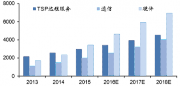 車聯(lián)網(wǎng)硬件 市場規(guī)模將從2013年的16.89億歐元增長到2018年的69.42億歐元,CAGR為32.67%, 增速非常強勁;TSP 遠程服務(wù)的 CAGR 為 15.94%;通信的 CAGR 為 29.28%。2015 年全球車聯(lián)網(wǎng)硬件、TSP 遠程服務(wù)、通信的市場規(guī)模已經(jīng)分別達到 34.31 億歐元、29.71 億歐元、15.13 億歐元,這已經(jīng)是一個非常大的市場。