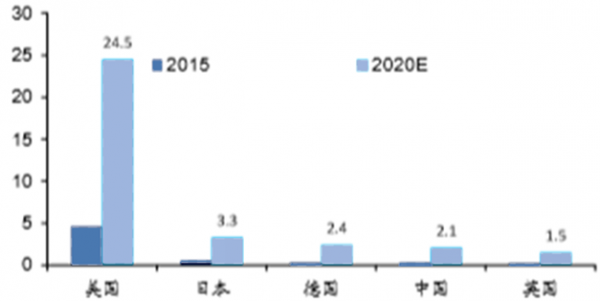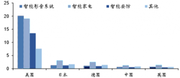 2020年全球主要國家智能家居家庭數預測(百萬戶)