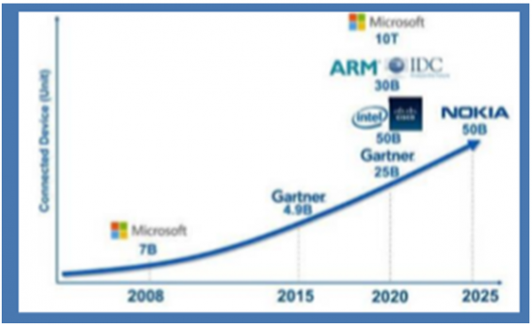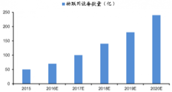 根據 Gartner 的預計,2015 年全球物聯網設備為 50 億臺,預計到 2020 年全球會有 240 億臺物聯網設備聯網,復合年均增速高達 36.9%。同時思科、華為、愛立信等 通信廠商均估計 2020 年的物聯網連接數量在 500 億至 1000 億個之間,遠超現在 70 多億部手機數量。物聯網市場的爆發將刺激相關硬件市場,物聯網為電子元器件制造商 提供了巨大的市場機遇。