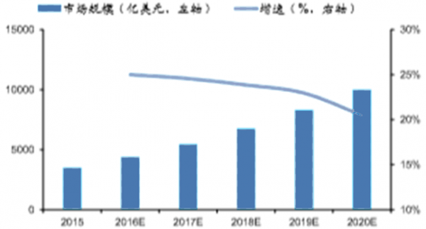 據預測,到 2020 年全球物聯網產業規模將達到 1 萬億美元,未來 5 年年 均復合增速為 23.4%。根據中國物聯網研究發展中心的數據,2014 年我國物聯網產業規模突破 6200 億元,同比增長 24%,2015 年市場規模達到 7500 億元,同比增長 21%。 預計,到 2020 年我國物聯網產業規模將達到 2 萬億,未來 5 年復合增速為 22%。