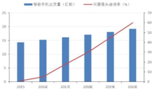 2015-2020 全球智能手機(jī)出貨量及雙攝像頭滲透率