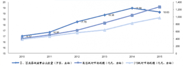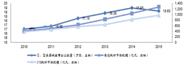 2015年高值耗材市場規模達1246億元,增長22%,IVD試劑市場 達1000億元,增長21%,而同期Ⅱ、Ⅲ類器械經營企業數量首次下降了2%,降到 18.63萬家,行業集中度得到提升,以后“兩票制” 等政策壓力下行業整合將會加速。