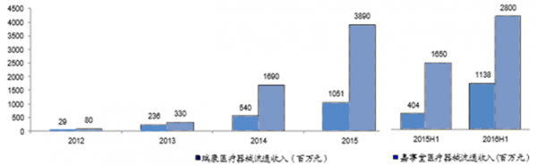 過去幾年來,特別是2013年開始,瑞康醫藥、嘉事堂大力整合骨科、心內科等高 值耗材經銷商,醫療器械流通收入迅速增加,2012年兩家公司高值耗材收入不足1億元,2015年嘉 事堂高值耗材收入達39億元,瑞康高值耗材流通收入達10億元,2016H1瑞康器械和高值耗材流通 收入達11.38億元,同比增長182%,嘉事堂器械和高值耗材流通收入超過28億,同比增70%,成 為公司主要增長點。