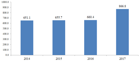 2014-2017 年全球醫(yī)療設(shè)備電源規(guī)模預(yù)測 (單位:百萬美元)